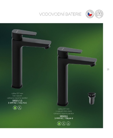 VODOVODNÍ BATERIE 23 výška 257 mm bez výpusti výklopný úsporný aerátor 58501/1,5 3 599 Kč | 142,75 € výška 257 mm s výpustí click-clack výklopný úsporný aerátor 58503,5 3 999 Kč | 158,64 €