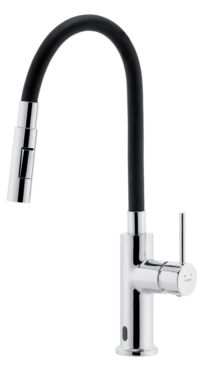 Objevte Ferro Distanza, kuchyňskou baterii nové generace. Bezdotykový senzor pohybu spustí vodu pouhým gestem – a přitom můžete stále používat klasickou páku pro přesné nastavení průtoku a teploty.
