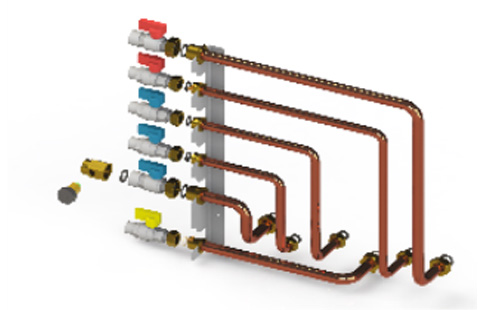 Levá připojovací sada ke kotli Solid Comfort s kulovými kohouty a filtry a s upevňovací lištou